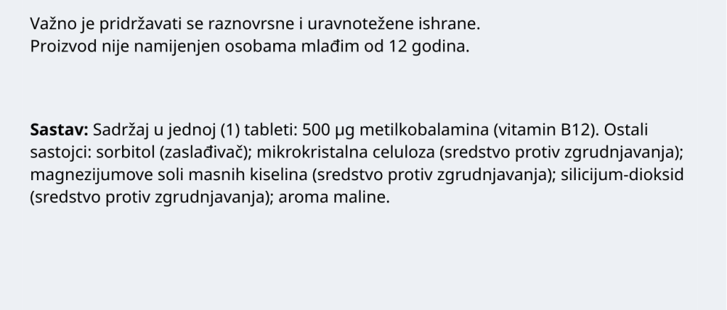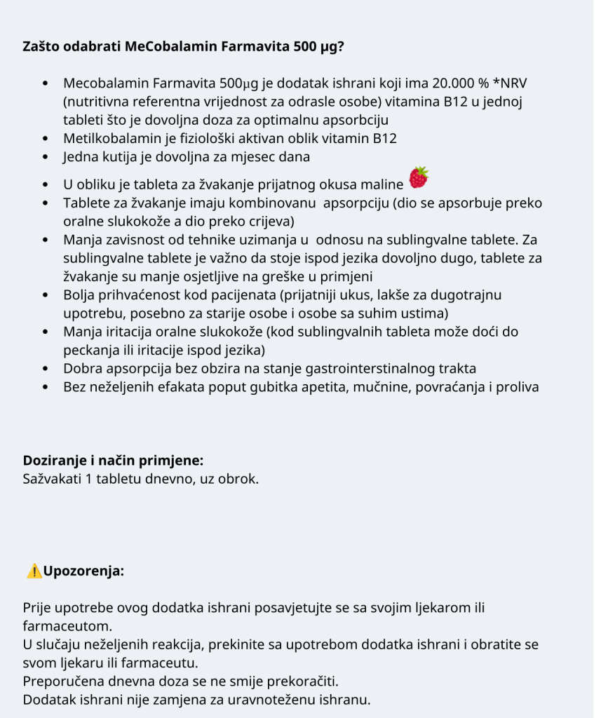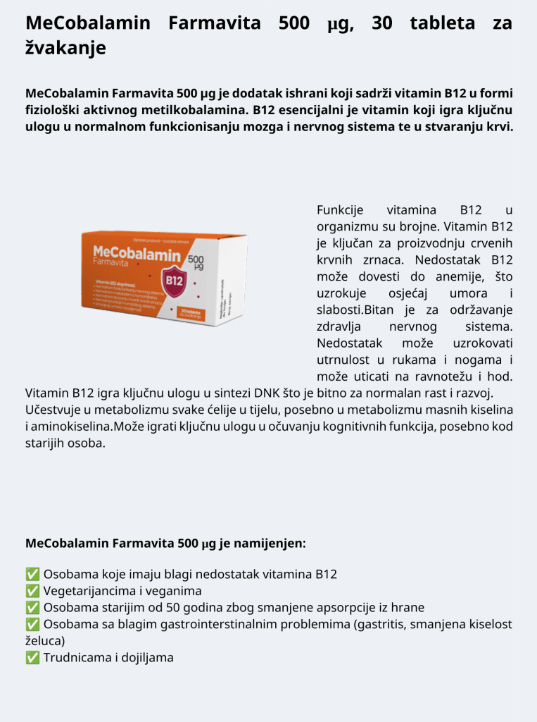 MeCobalamin Farmavita 500 µg, 30 tableta za žvakanje